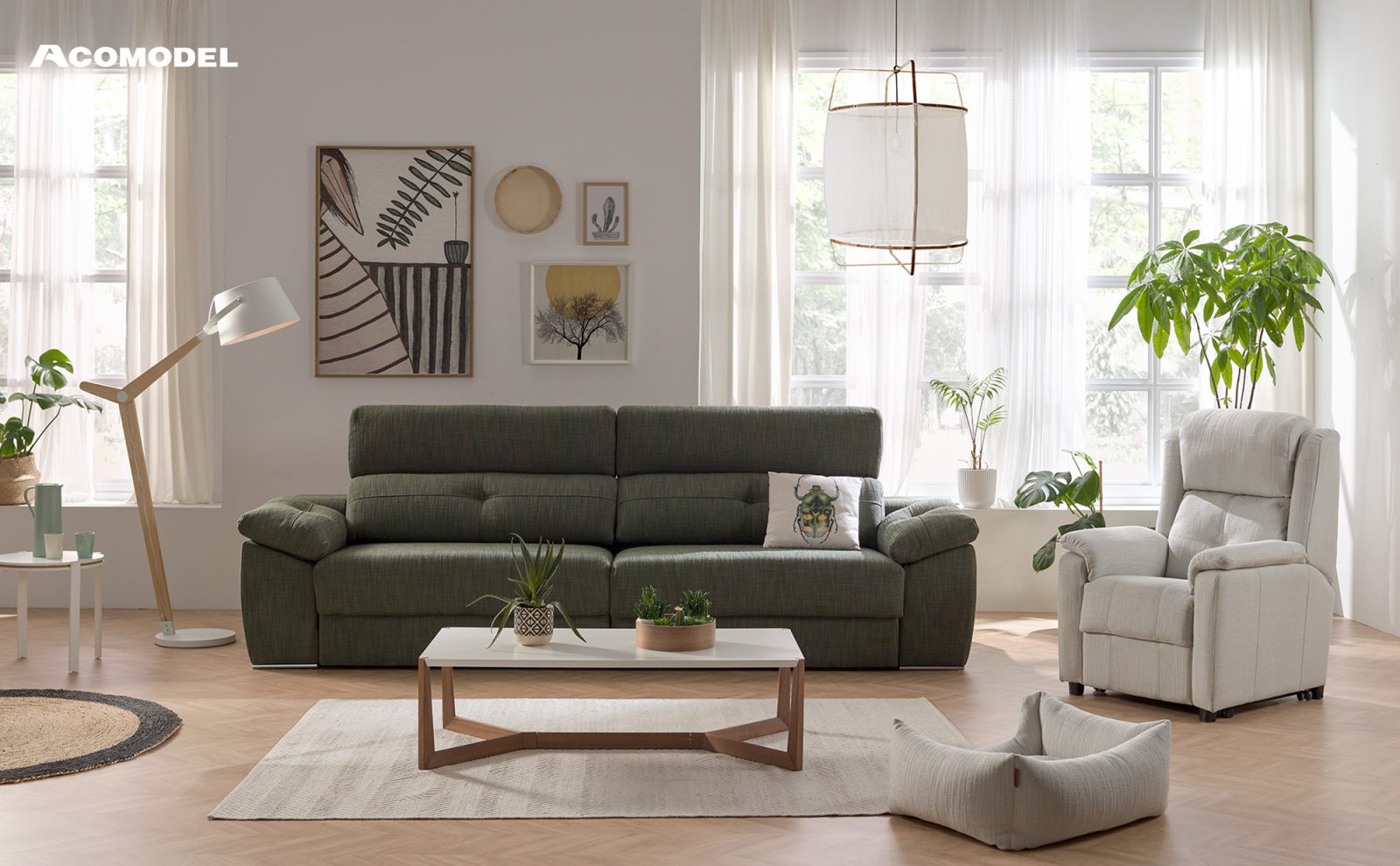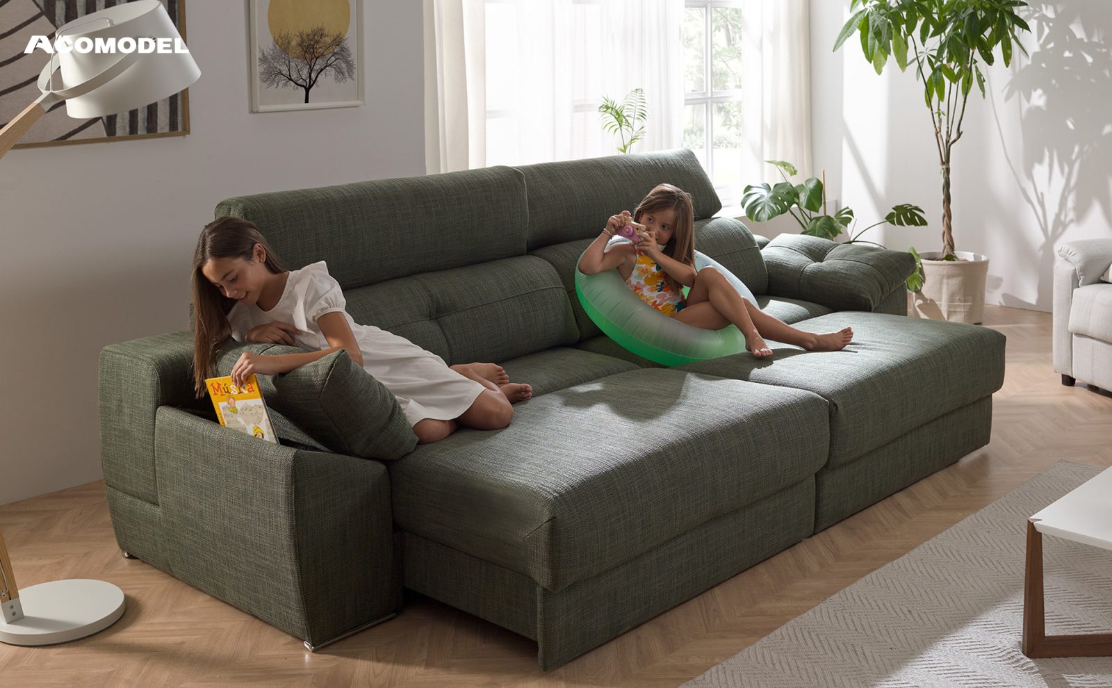 Este modelo funcional, dinámico y original está pensado para nuestra nueva forma de descanso. Acciona un nuevo sofá de Acomodel que combina entre sí sus diferentes sistemas, dónde también conseguirás máxima capacidad de almacenaje con el brazo arcón y pouf.